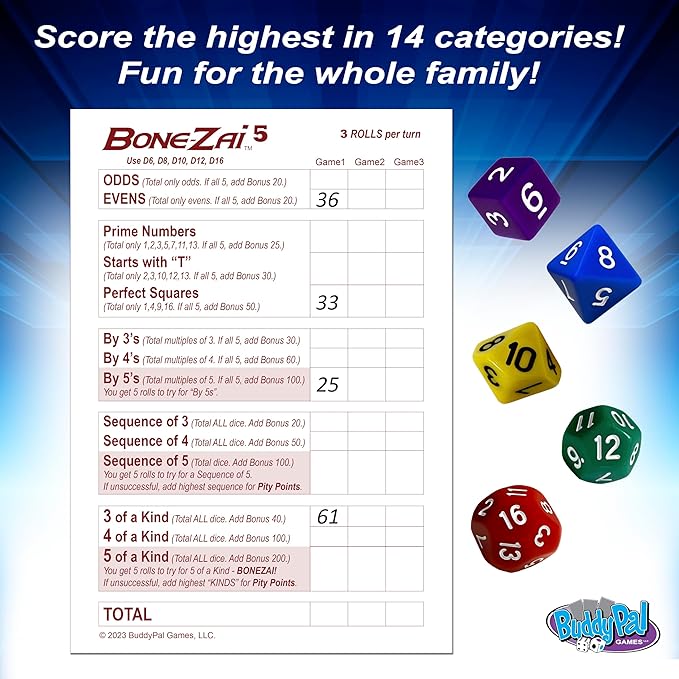 - What’s your strategy? Keep higher points on the dice? Get all dice to match a category for bonus points? Or take a chance for a Bone Zai 5! (all 5 dice matching!).