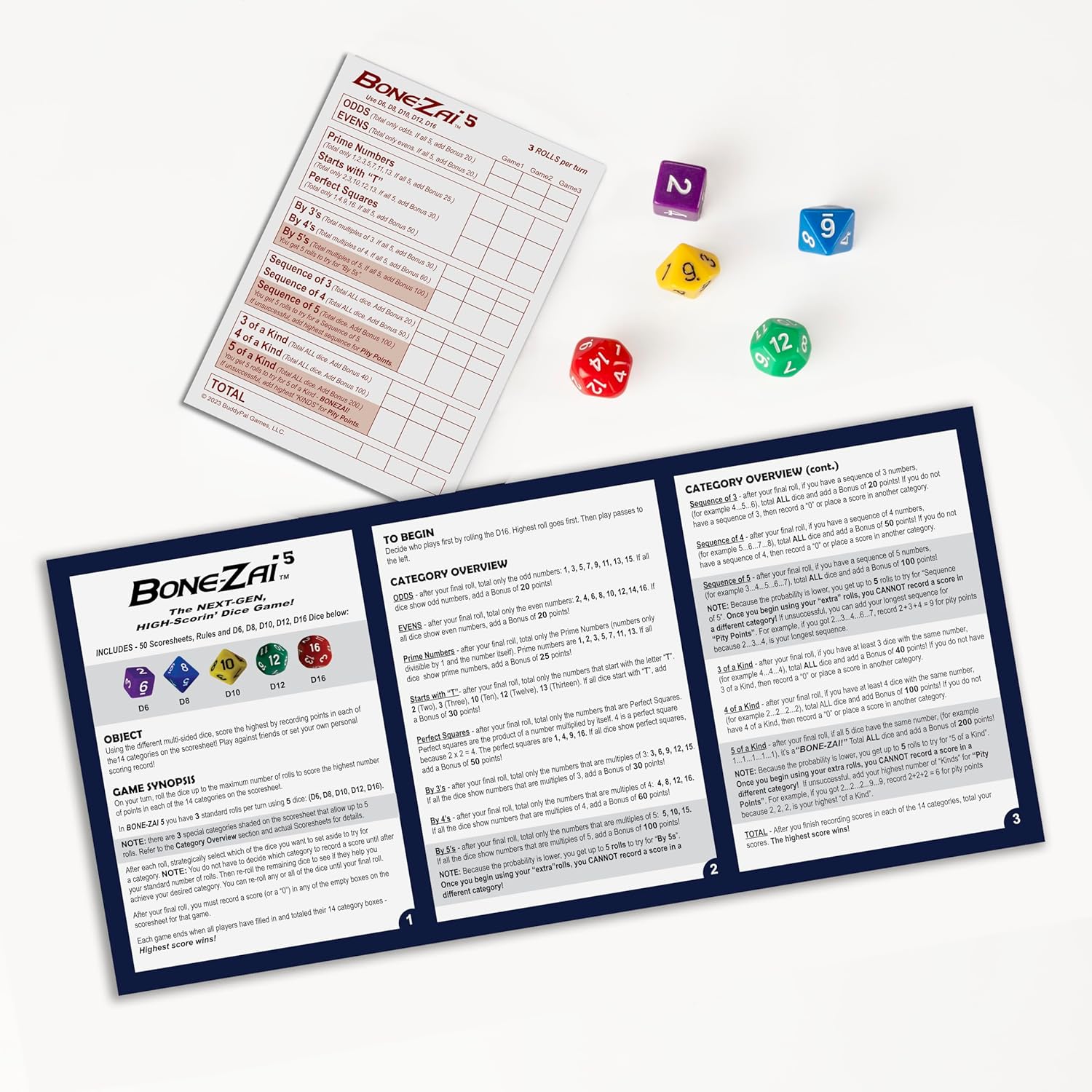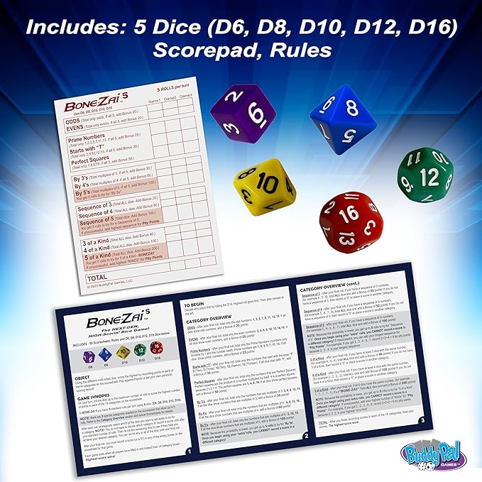 - 5 uniquely-sided, colorful dice (D6, D8, D10, D12 and D16) offer whole new dimensions to scoring!